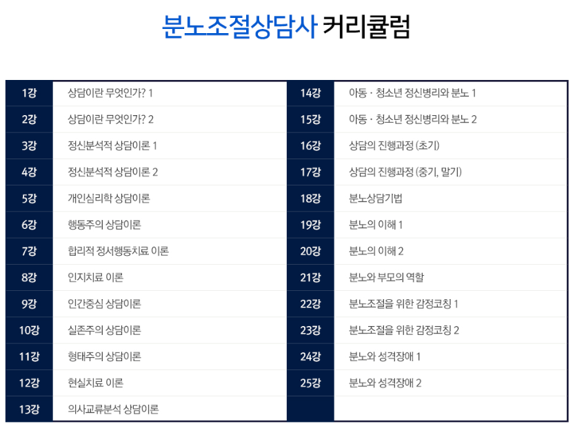 분노조절상담사취득조건 은 만 19세 이상 정신분석적 상담이론 분노상담기법, 분노의 이해, 분노와 성격장애 등에 관심이 있다면 지역, 성별에 관계없이 누구나 무료로 온라인 교육을 받을 수 있습니다.