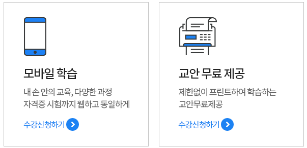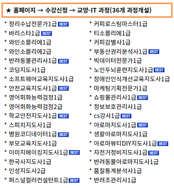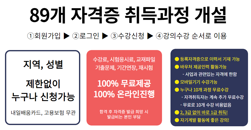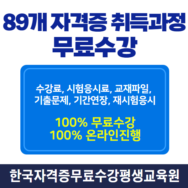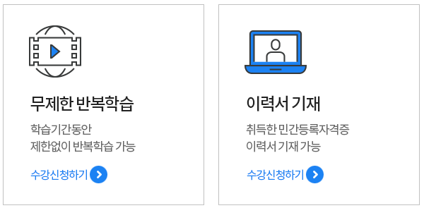 모든 자격증과정들은 직접 교육원에 방문하지 않고 PC나 모바일을 통해 집에서 편리하게 자격증 교육을 받을 수 있게 개설되어 있어서 지방에 거주하신분들도 부담 없이 수강을 할 수 있습니다.