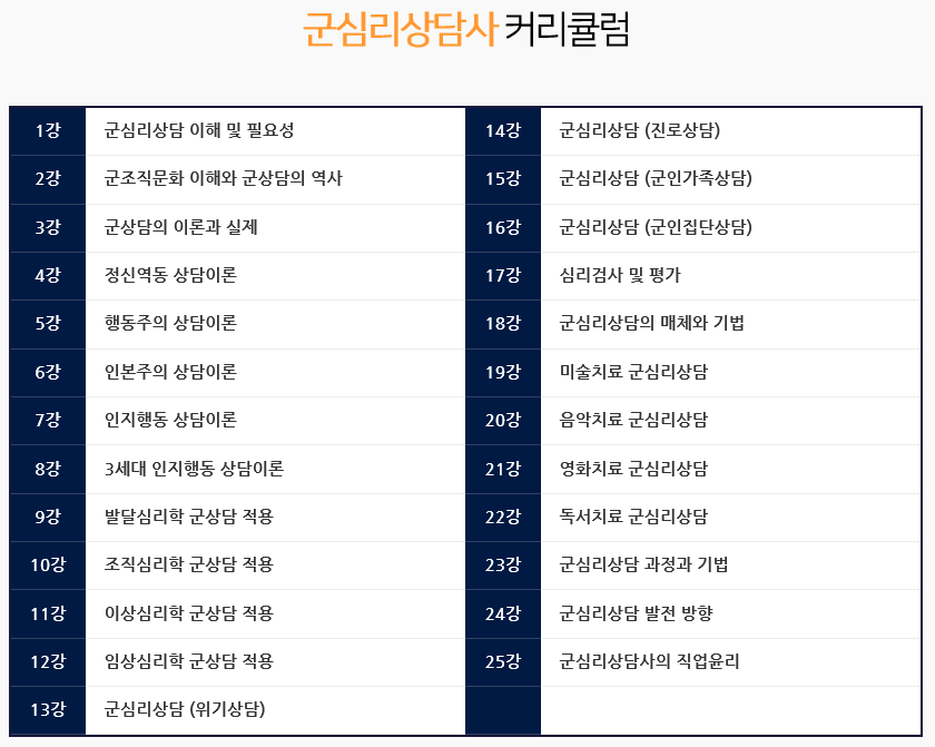 군심리상담사취득조건 은 고졸 이상 군심리상담 이해 및 필요성, 조직심리학 군상담 적용 등 군심리상담에 관심이 있는 분들은 누구나 온라인 무료로 군심리상담교육 을 받을 수 있습니다.