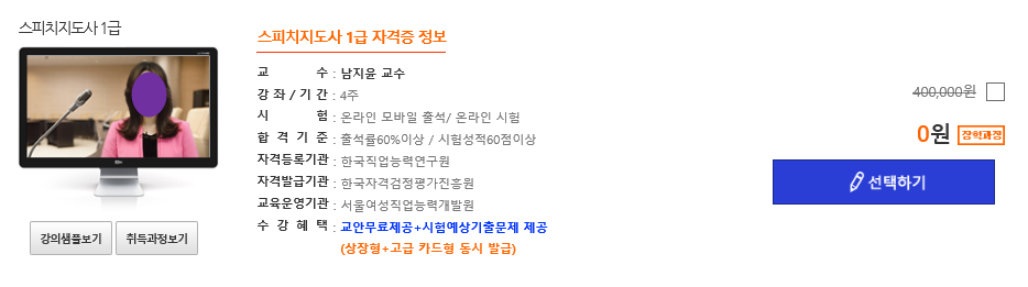 우리 교육원에 운영중인 스피치지도사자격증 과정은 스피치지도사2급 이나 3급 자격증이 없어도 스피치지도사1급자격증 으로 취득을 할 수 있고 비갱신형으로 이력서에도 기재가 가능합니다.