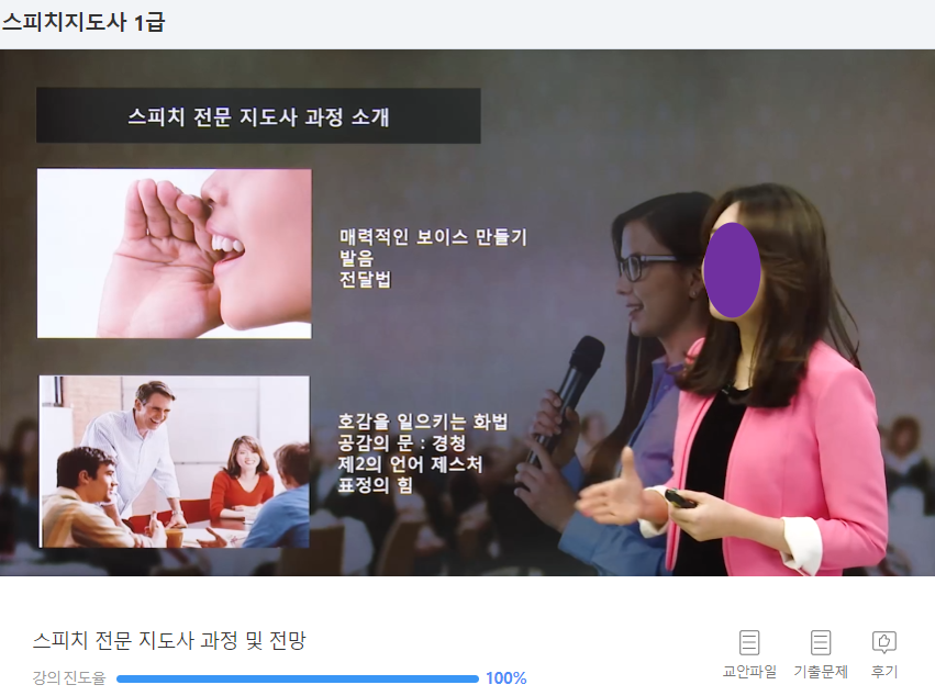 개강된 강의는 개인의 스케줄에 맞춰서 수강을 할 수 있고 스피치지도사자격증시험 은 온라인 출석류 60% 이상 충족이 되면 개별적으로 응시가 가능하고 스피치지도사자격증시험일정 은 없습니다.
