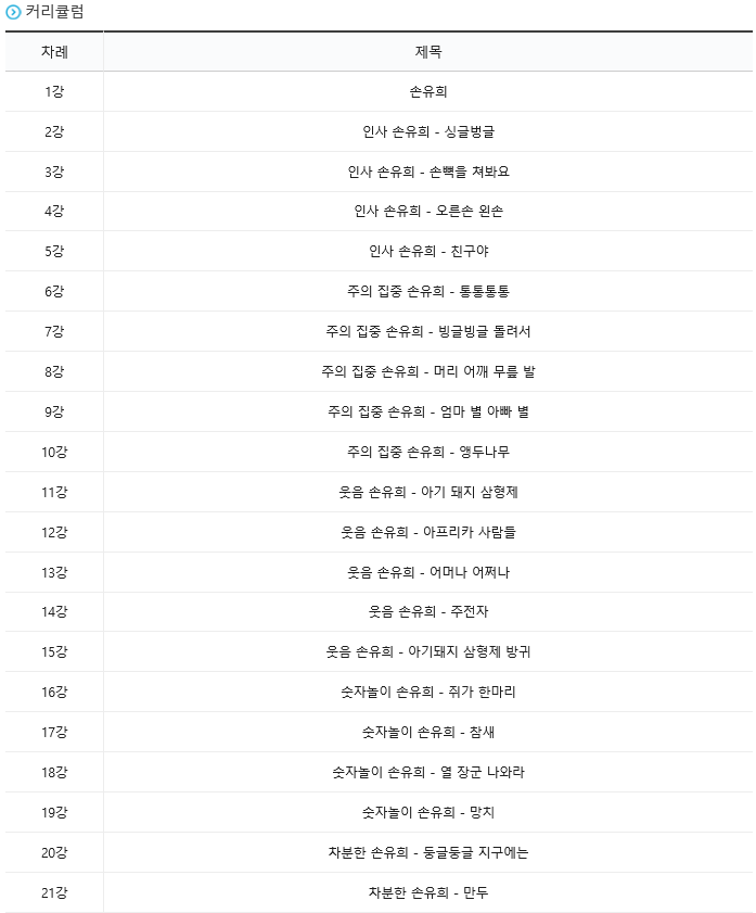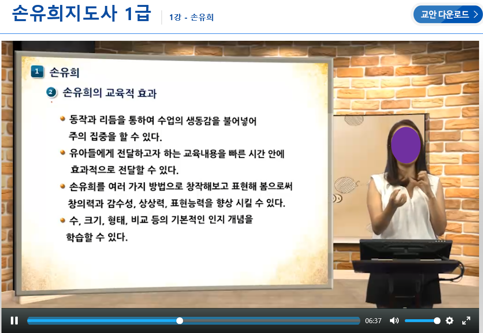 손유희지도사1급과정 은 아이들에게 가장 인기 있는 손유희를 신학기에 적절한 손유희, 분위기를 차분하게 만드는 손유희, 분위기를 돋우는 손유희, 부모님과 함께 할 수 있는 손유희, 숫자를 세어보는 손유희, 신나게 노래하는 손유희를 분류하여 교사들이 실제 활용하기 편리하게 배울 수 있는 장점이 있다.